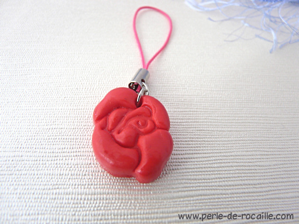 Bijou pour portable composé d'un pendentif rose rouge en pâte polymère/fimo vernis